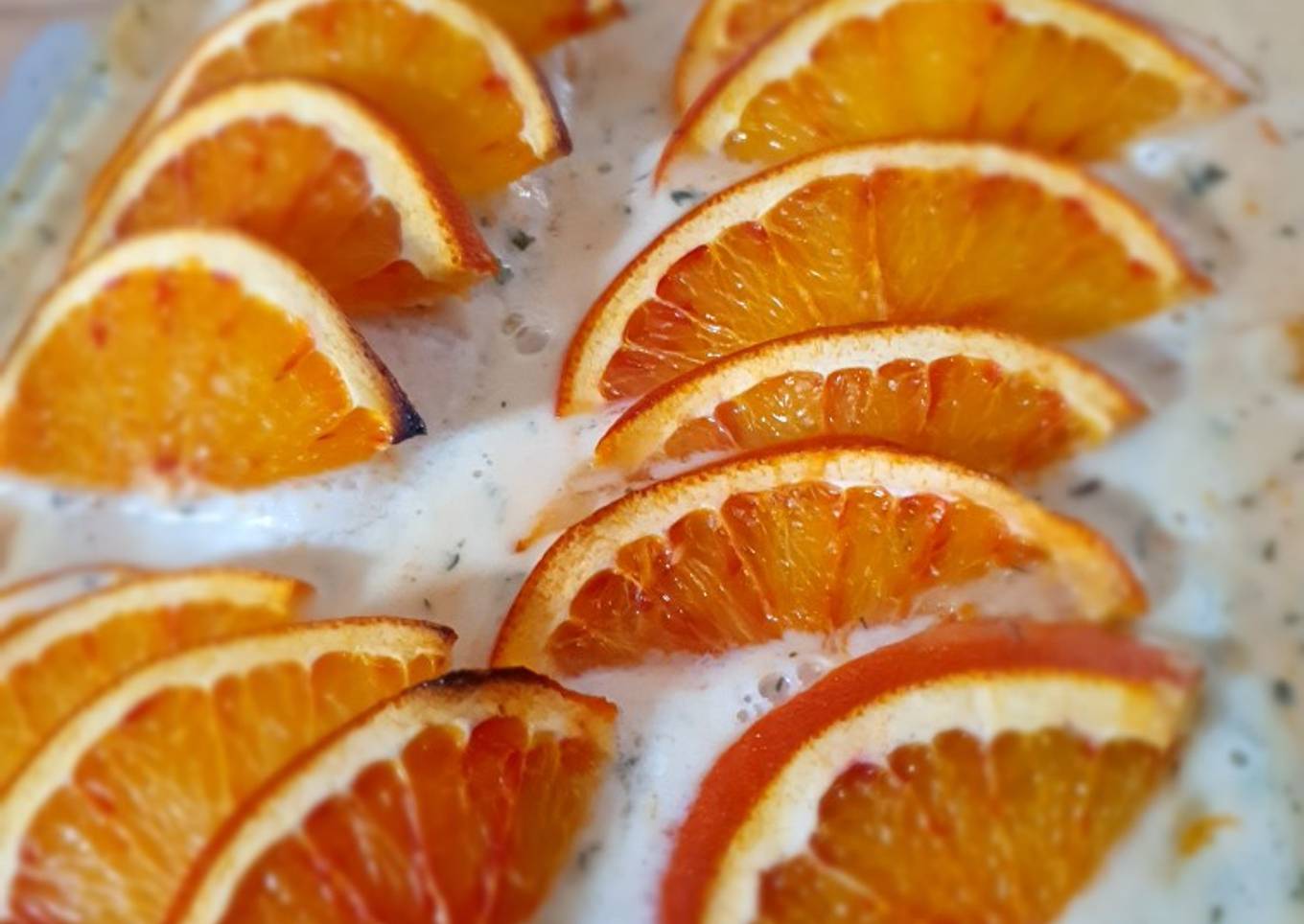 - Couvrir avec la préparation crème eau Fumet, tranché la dernière orange et disposer les rondelles sur les filets de poisson.