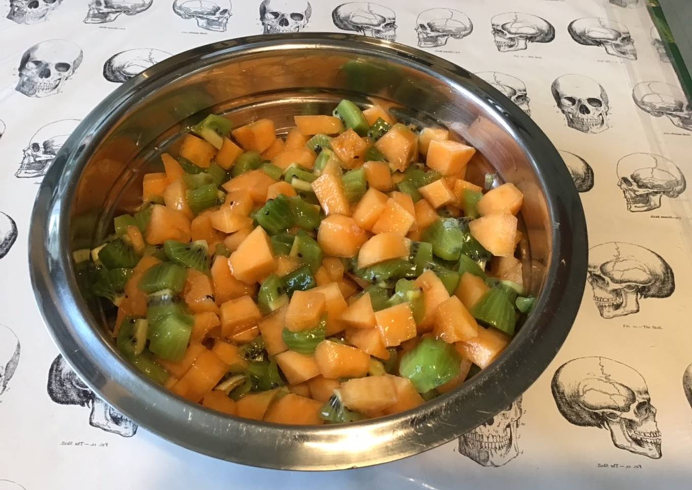 - Couper les kiwis en morceaux mettre les dés de melon dans un grand saladier