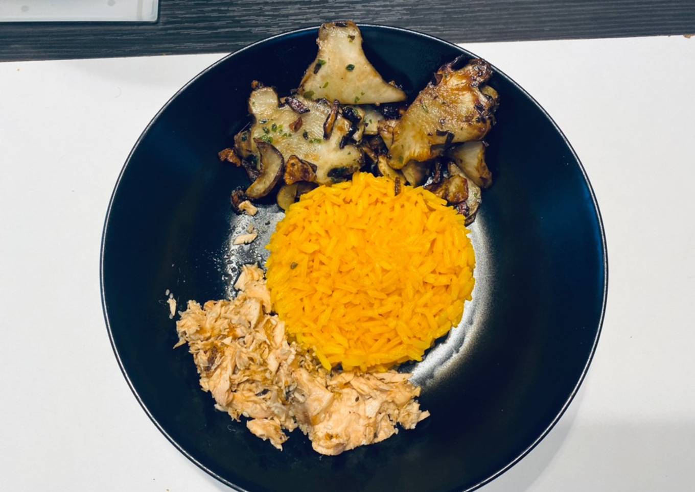 - Dresser l’assiette au milieu de l’assiette le riz qui à pris une belle couleur jaune/orangé, ajouter les topinambours bien grillés, et le saumon émietté. Déguster!